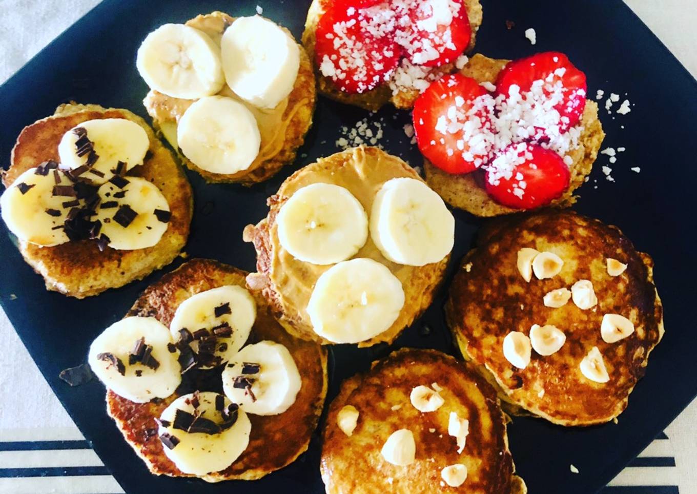 - A una tortita le ponemos fresa y coco a otra crema de cacahuete y plátano.