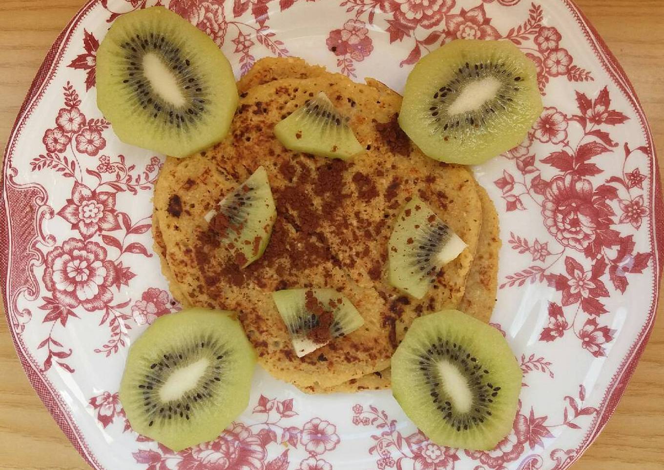 - Para decorar troceamos un kiwi y lo adornamos alrededor de las tortitas y echamos media cucharada de cacao puro desgrasado.